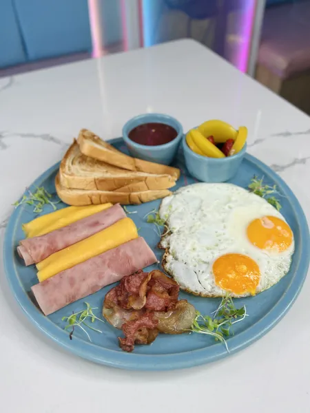 HUEVOS ENTEROS TOCINETA PAN TOSTADO JAMON Y QUESO