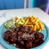 200G DE POLLO TEMPURIZADO BAÑADO EN SALSA BBQ ACOMPAÑADO DE ENSALADA CESAR Y PAPAS FRITAS