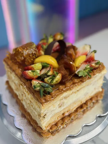 TORTA DE HOJALDRE PEQUEÑA RELLENA DE CREMA PASTELERA Y DECORADA CON AREQUIPE Y FRESAS