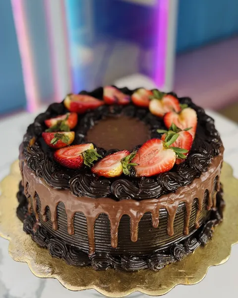 TORTA DE BROWNIE CON CENTRO DE CHOCOLATE Y CUBIERTO DE CHOCO-AREQUIPE, DECORADO CON FRESAS